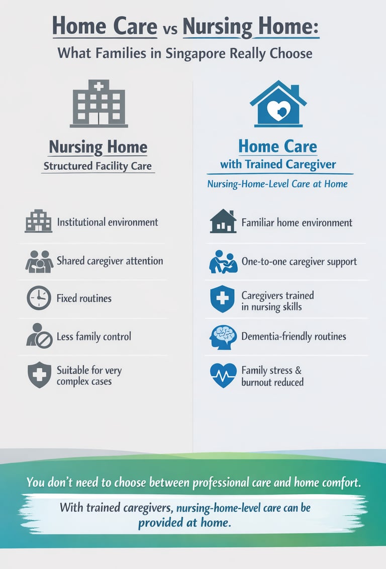 Compare home care vs nursing home options in Singapore. Discover how trained caregivers deliver nursing-home-level care at home while easing family stress and burnout.